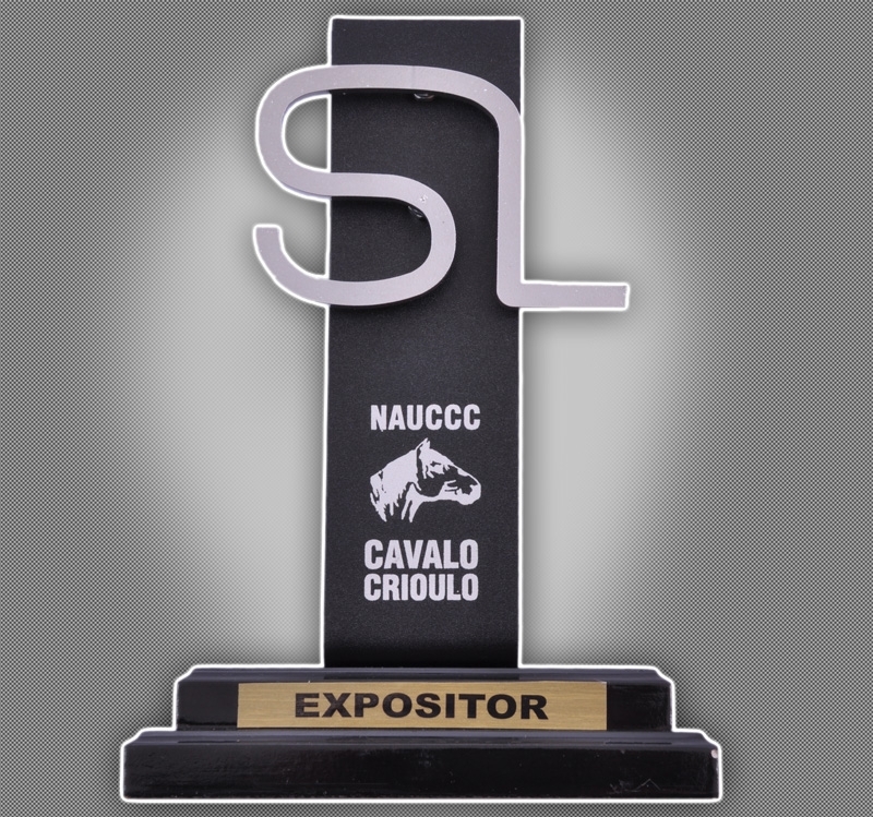 Haste em chapa inox jateado, logomarca fundida em bronze e resinada, base madeira mogno c/ forracao anti risco, etiqueta resinada....